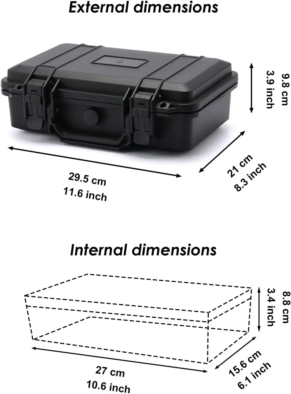 الحجم الخارجي: 296*212*96 مم - 11.65’*8.35’*3.78’ الحجم الداخلي: 270*160*85 مم - 10.63’*6.3’*3.35’ عمق الغطاء: 27 مم - 1.06’ عمق القاعدة: 58 مم - 2.28’ |
