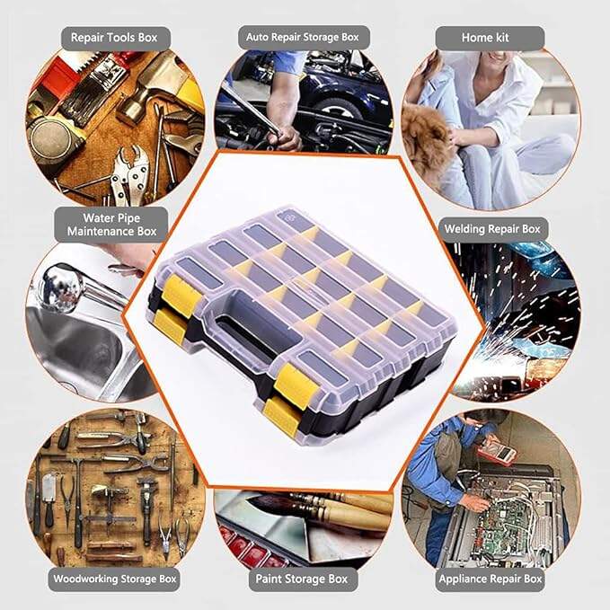 صندوق منظم الأدوات بـ 3.19 قسم: تصميم ثنائي الوجه، ويمكن تحريك الفواصل القابلة للإزالة أو إزالتها بسهولة لتخصيص مساحة تخزين البراغي للأدوات، والبراغي، والمسامير، والأجزاء الصغيرة، ومعدات الصيد، والعديد من العناصر الأخرى