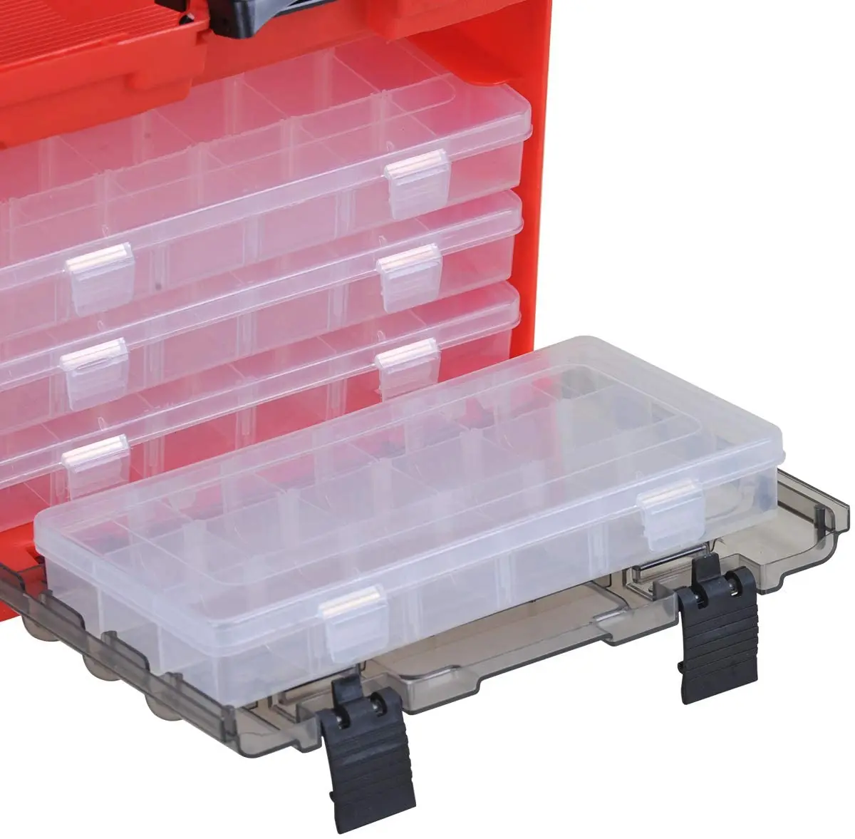 التحمل مهم عند وجودك في الهواء الطلق، وهذه العلبة توفره. فبلاستيك الصب يقاوم التعامل الخشن والصدمات اليومية. وتساعد الحواف المستديرة على تقليل احتمالية ظهور شقوق أو تشققات مع مرور الوقت. حتى مع الاستخدام المنتظم، تظل الأقفال والمقبض متينين، مما يمنحك أداءً موثوقًا به في كل رحلة. والأغطية الشفافة قوية بما يكفي لحماية المحتويات مع السماح برؤيتها بسرعة.
