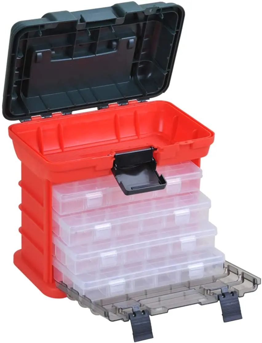 من الداخل، توفر الطبقات الأربع عدة أقسام وصواني تساعدك على فصل وتنظيم الأغراض. وتُعد الصواني مثالية للقطع الصغيرة مثل الخطافات والطعم والمقابس والمحوريات، في حين يمكن للأقسام الأكبر أن تحتوي الخيط والملاقط والسواطير أو أدوات أخرى. ويتيح لك البلاستيك الشفاف لكل طبقة رؤية ما بداخلها دون الحاجة إلى فتح كل قسم، مما يوفر الوقت ويقلل من الإحباط. ويجعل ذلك من السهل العثور على ما تحتاجه بنظرة واحدة، خاصةً عندما تكون خارجًا على الماء أو تعمل في مشروع ما.