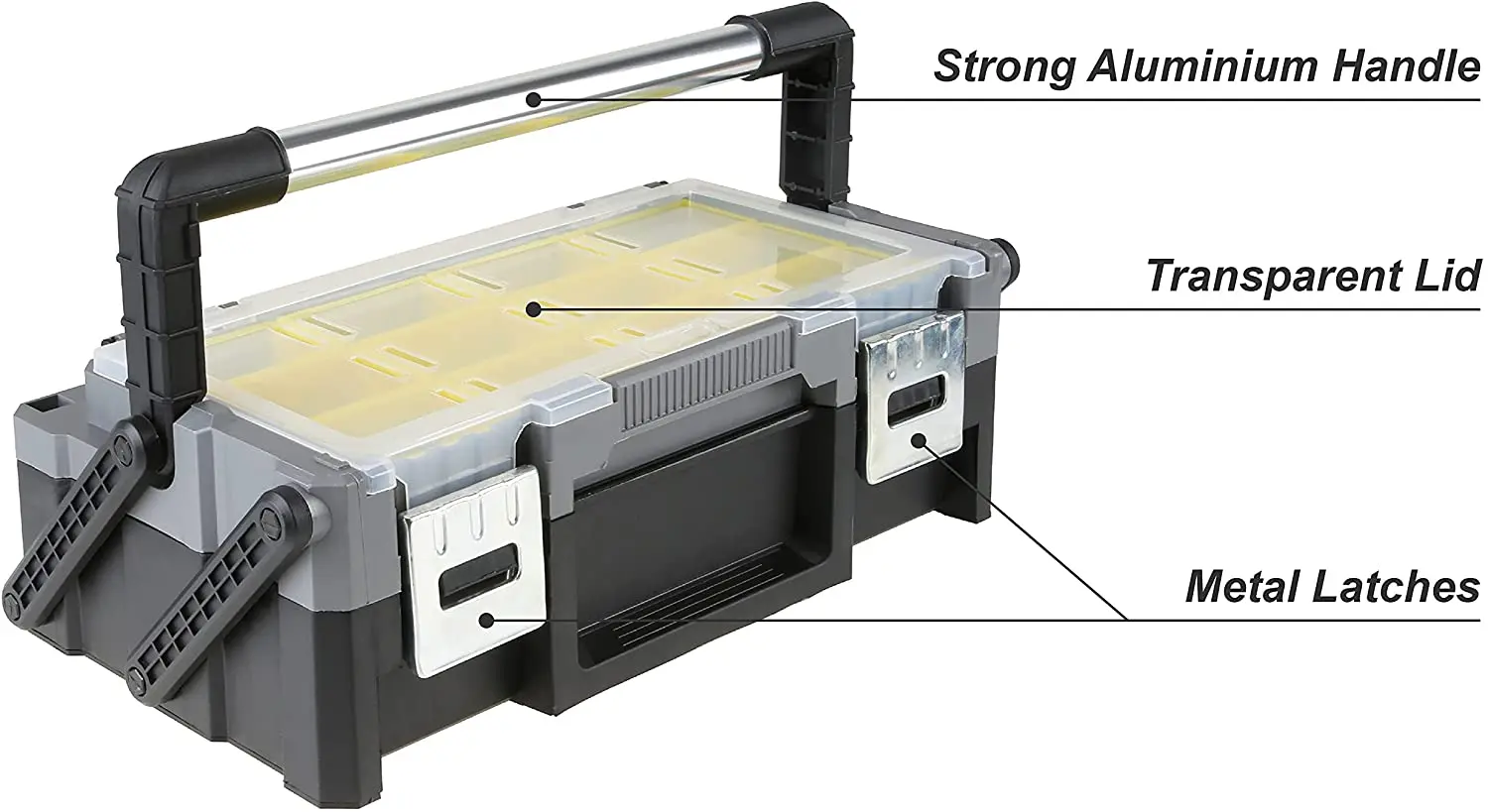 Les couvercles et les bords du bac présentent des tolérances strictes qui permettent de bien contenir les petits objets. Chaque compartiment se ferme fermement, réduisant ainsi le risque de déversement lors des déplacements. Le loquet central est robuste et facile à ouvrir d'une seule main quand nécessaire, tout en étant suffisamment sécurisé pour éviter toute ouverture accidentelle. Une poignée de transport confortable est intégrée au sommet, ergonomiquement conçue pour réduire la fatigue de la main, même lorsque l'organisateur est pleinement chargé. Sa répartition équilibrée du poids facilite son transport sur un chantier ou dans les escaliers.