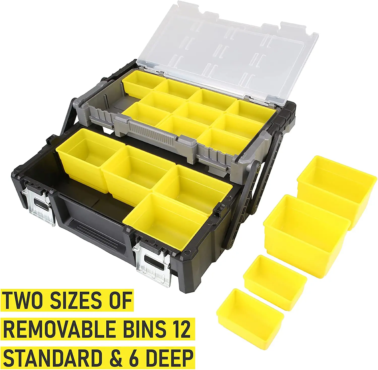 L'une des fonctionnalités les plus pratiques de l'organiseur est son ensemble de bacs amovibles. Ces petits compartiments individuels s'emboîtent fermement dans les plateaux en porte-à-faux, mais se retirent facilement lorsque vous devez transporter une sélection de pièces vers un établi ou un poste de travail. Chaque bac possède une taille adaptée à divers clous, vis, rondelles et axes, vous offrant la souplesse de séparer les matériaux par taille, type ou projet. Le design amovible simplifie également le réapprovisionnement : videz un bac dans un contenant principal, remplissez-le à nouveau, puis remettez-le en place d'un simple clic, sans complication